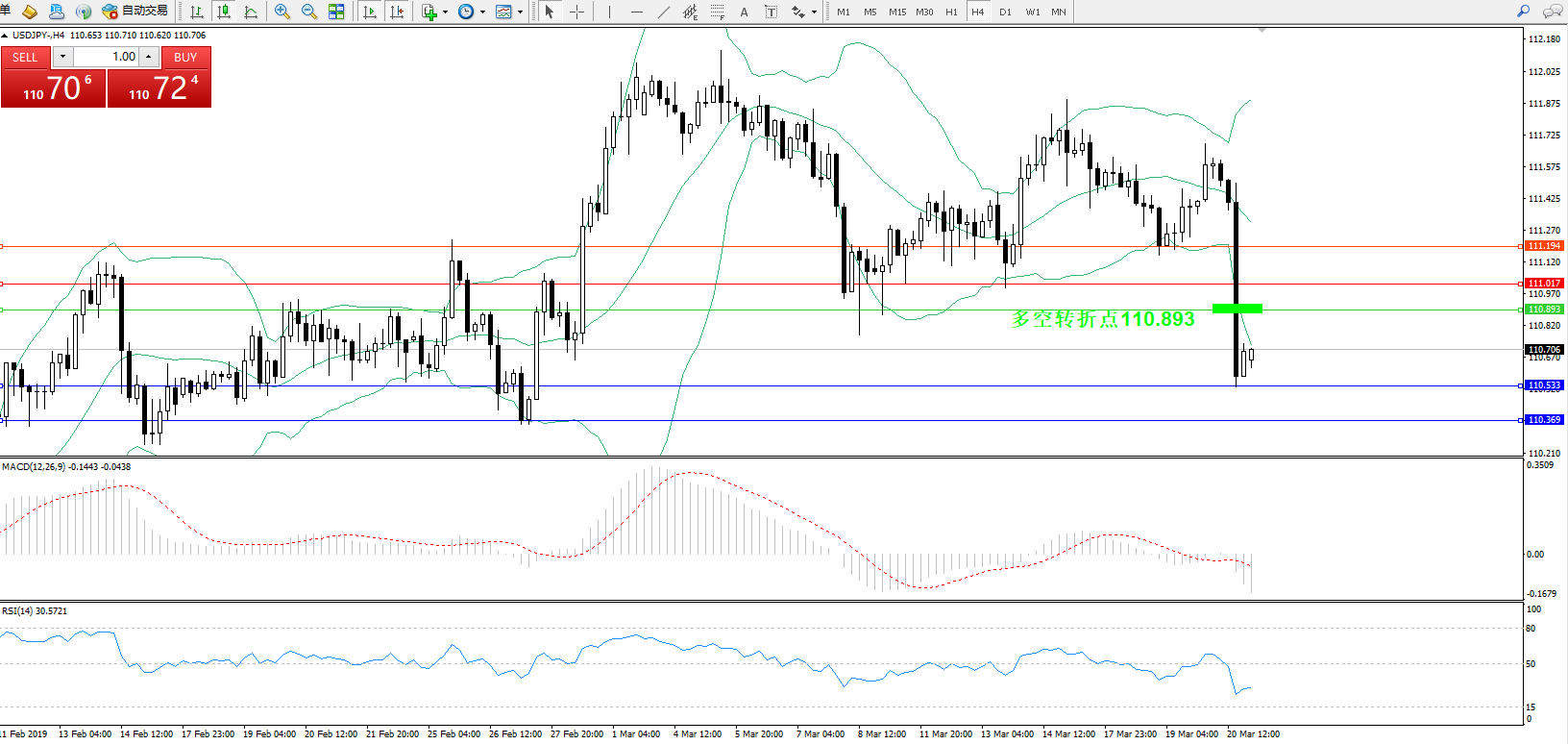 北京时间3月21日凌晨02:00,美联储利率决议按兵不动,下调利率“点阵图”、下修经济增长与通胀预期,宣布将逐步停止“缩表”,政策鸽派程度高于预期。消息公布后,美元下挫近70点,跌破96关口,刷新近三周低点至96.75,美联储FOMC声明显示,委员们一致同意此次利率决定。美联储预估显示,2019年预计加息一次,此前预估为加息两次。美联储点阵图维持2020年加息一次的预测。日圆向110.586附近徘徊。