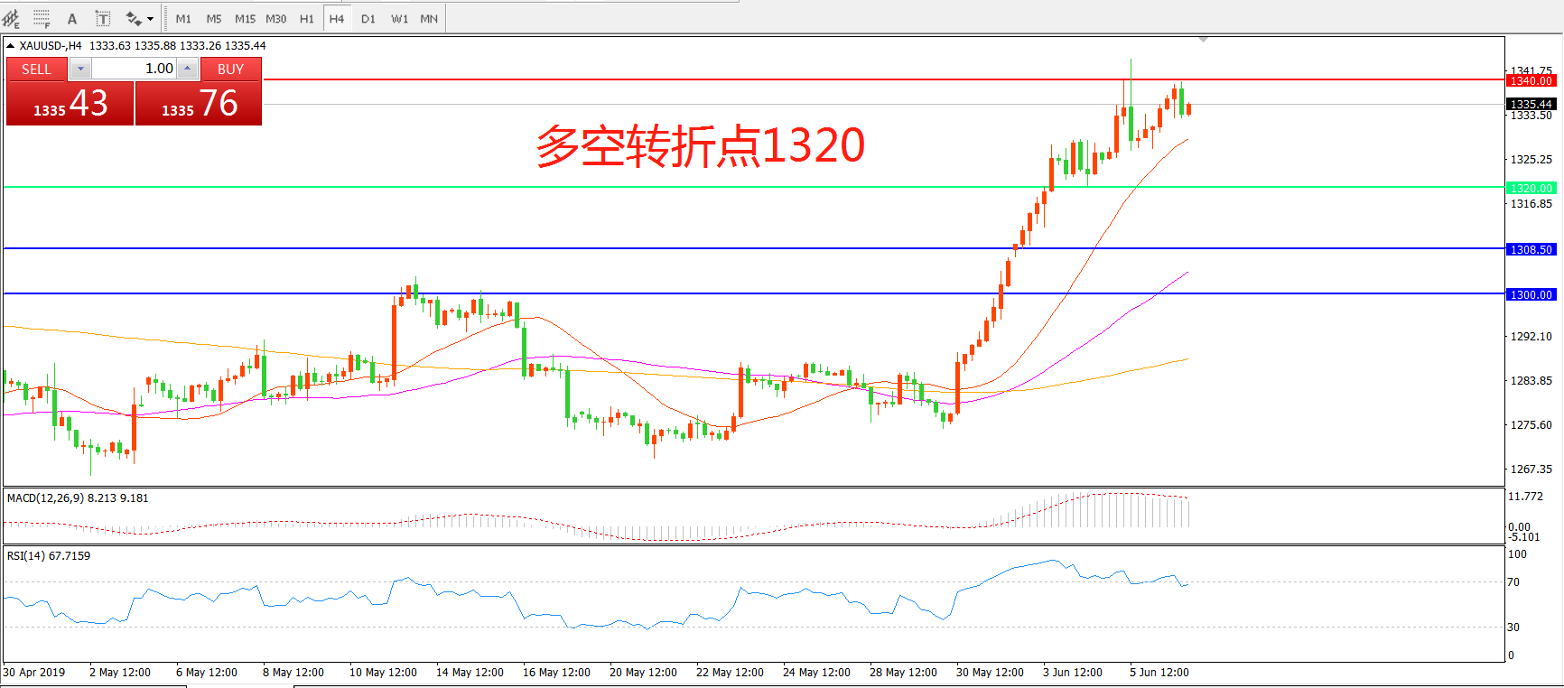 4小时图看,金价连续上行后触碰1340阻力后回落,整体走势依然偏多,均线系统呈多头排列,MACD红柱增加,RSI指标走平,短期以多头思路对待。