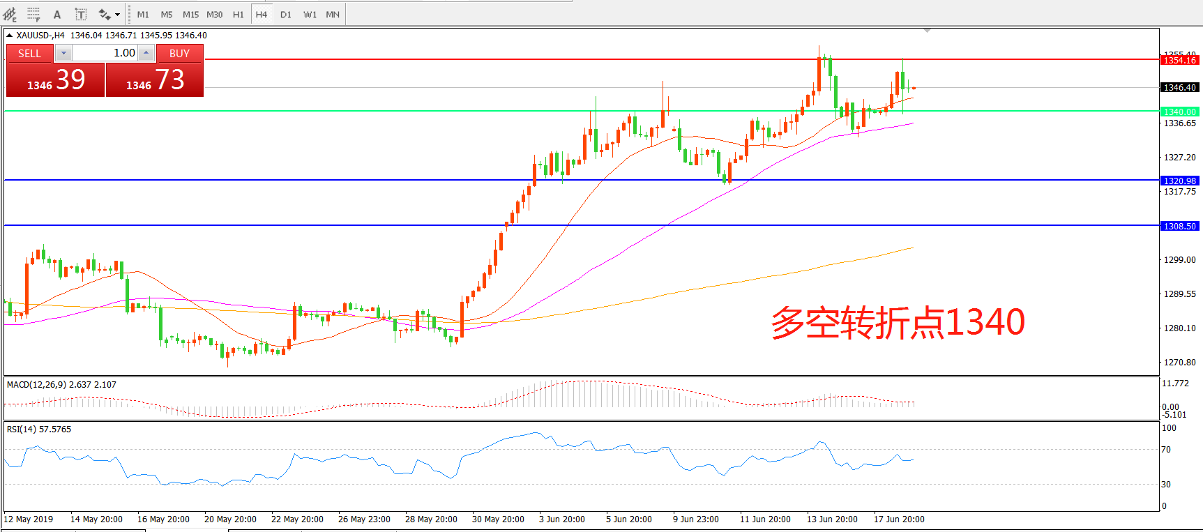 周二(6月18日)据央视新闻报道,习近平应约同美国总统特朗普通电话,指出中美合则两利、斗则俱伤。愿意同特朗普在二十国集团领导人大阪峰会期间举行会晤。该消息助燃市场风险偏好情绪,黄金急挫近15美元,但金价走势依然十分坚挺,随后震荡回升,最终收于1346.59美元/盎司。