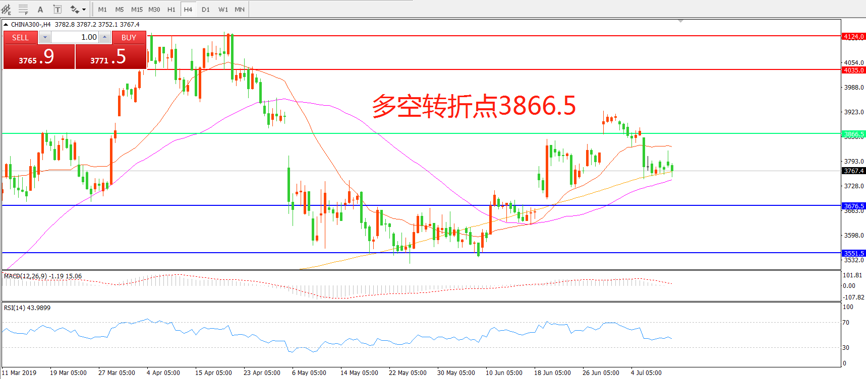 4小时图看,沪深300指数近期长阴下破后无力反弹,整体走势偏弱,但长期均线系统依然成为下方支撑,MACD红柱缩短,RSI指标走平,日内延续震荡概率较大。