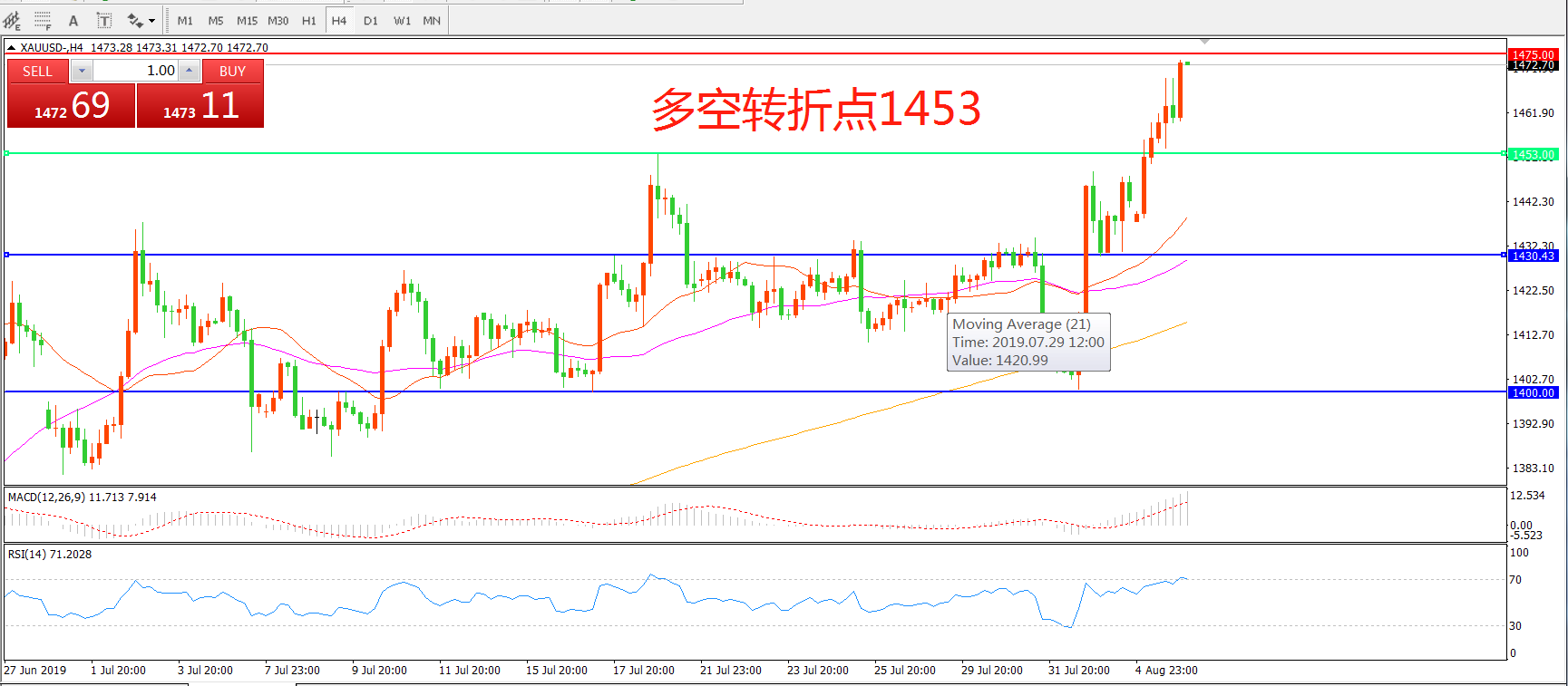 中美贸易问题和人民币贬值引爆了市场的恐慌情绪,美国三大股指惨遭“血洗”,避险情绪推升金价创下6年新高,最终收报1472.44美元/盎司,对全球经济增长放缓以及各大央行进入宽松状态的担忧推动了黄金的强势表现。