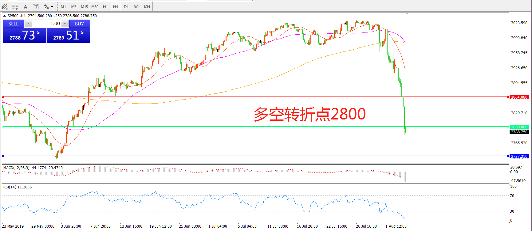 中美贸易问题和人民币贬值引爆了市场的恐慌情绪,风险资产大幅下跌,美国三大股指惨遭“血洗”,道琼斯指数狂泻600点,纳斯达克指数下破8000点,跌幅一度扩大至3%,标普500跌超2%,最终收报2788.25点,芯片股悉数大跌,苹果和亚马逊的市值双双跌破9000亿美元,中概股大部分跟跌。