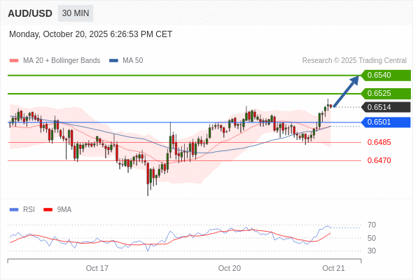 在 0.6501 之上,看涨,目标价位为 0.6525 ,然后为 0.6540 。