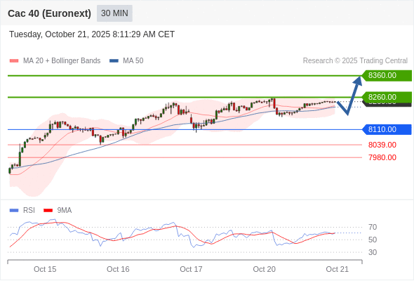 法国CAC指数期货 (Euronext) (X5) 当日内: 在8110.00之上,看涨。