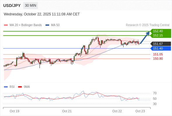 在 151.40 之上,看涨,目标价位为 152.15 ,然后为 152.40 。