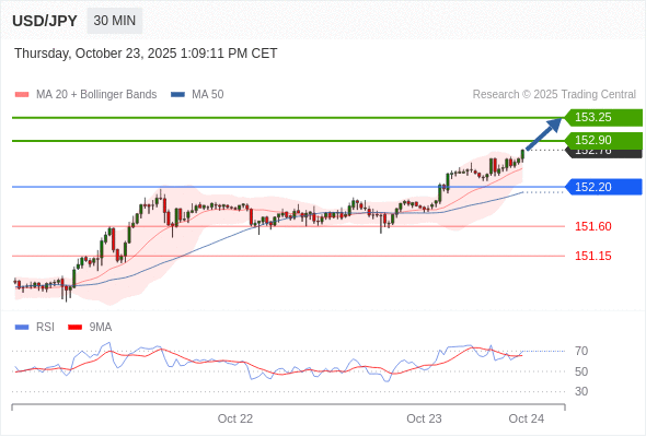 在 152.20 之上,看涨,目标价位为 152.90 ,然后为 153.25 。