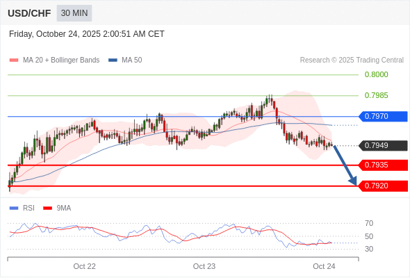 在 0.7970 之下,看跌,目标价位为 0.7935 ,然后为 0.7920 。