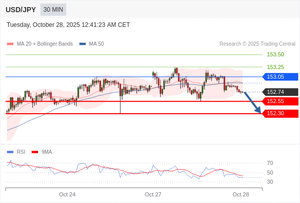 在 153.05 之下,看跌,目标价位为 152.55 ,然后为 152.30 。