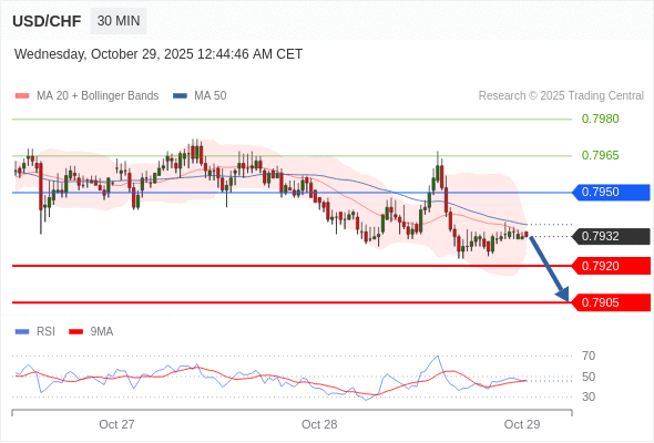 在 0.7950 之下,看跌,目标价位为 0.7920 ,然后为 0.7905 。