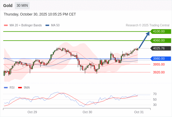 在 3980.00 之上,看涨,目标价位为 4060.00 ,然后为 4100.00 。