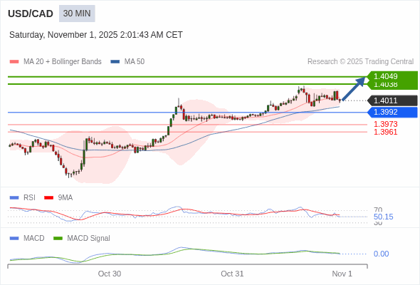 美元/加元 当日内 : 看涨,当 1.3992 为支撑位,目标定在1.4049。