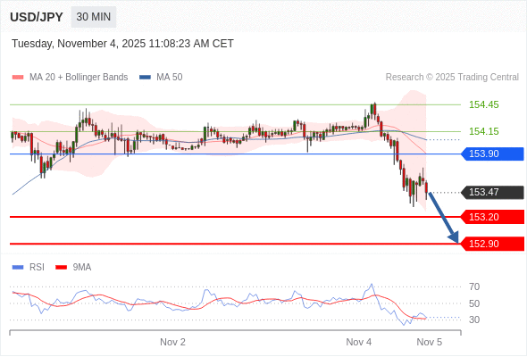 在 153.90 之下,看跌,目标价位为 153.20 ,然后为 152.90 。