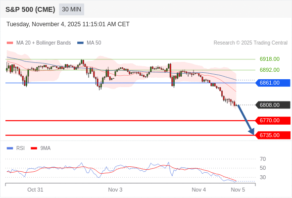 交易策略: 在 6861.00 之下,看跌,目标价位为 6770.00 ,然后为 6735.00 。
