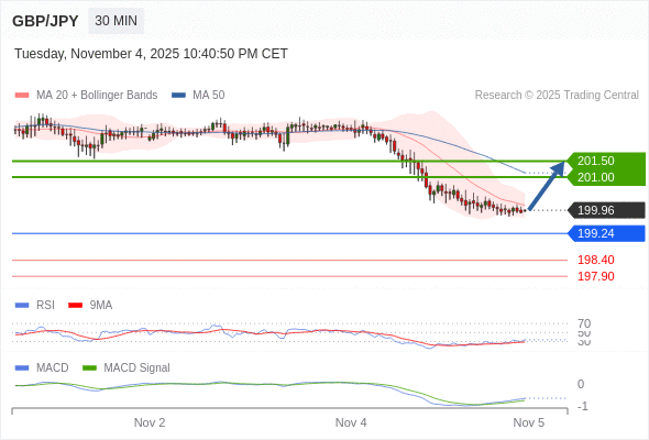 英镑/日元 当日内: 有上涨的可能,目标价位定在 201.50 。