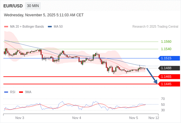 在 1.1515 之下,看跌,目标价位为 1.1465 ,然后为 1.1445 。