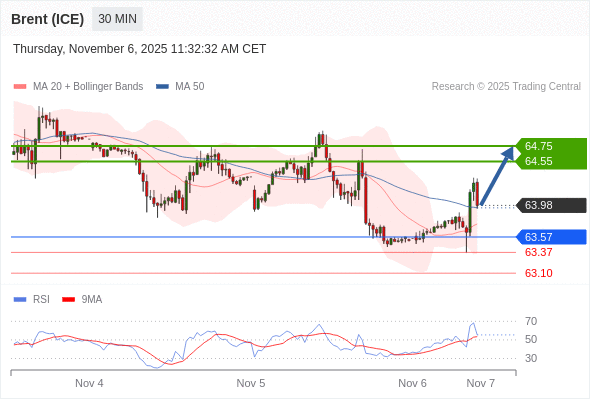 在 63.57 之上,看涨,目标价位为 64.55 ,然后为 64.75 。