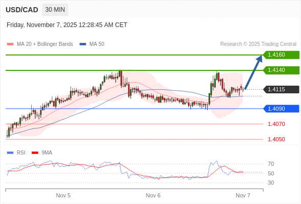 在 1.4090 之上,看涨,目标价位为 1.4140 ,然后为 1.4160 。