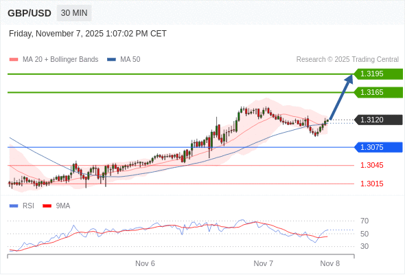 在 1.3075 之上,看涨,目标价位为 1.3165 ,然后为 1.3195 。