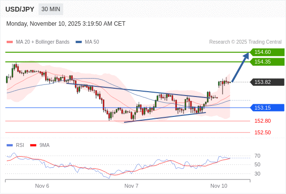 在 153.15 之上,看涨,目标价位为 154.35 ,然后为 154.60 。