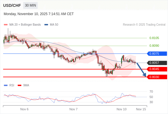 在 0.8075 之下,看跌,目标价位为 0.8045 ,然后为 0.8030 。