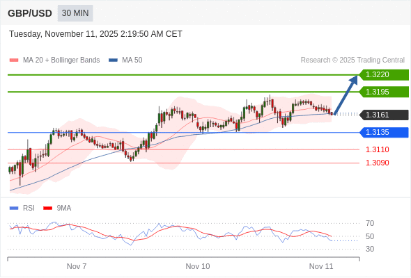 在 1.3135 之上,看涨,目标价位为 1.3195 ,然后为 1.3220 。