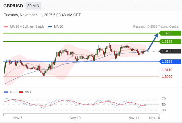 在 1.3135 之上,看涨,目标价位为 1.3195 ,然后为 1.3220 。