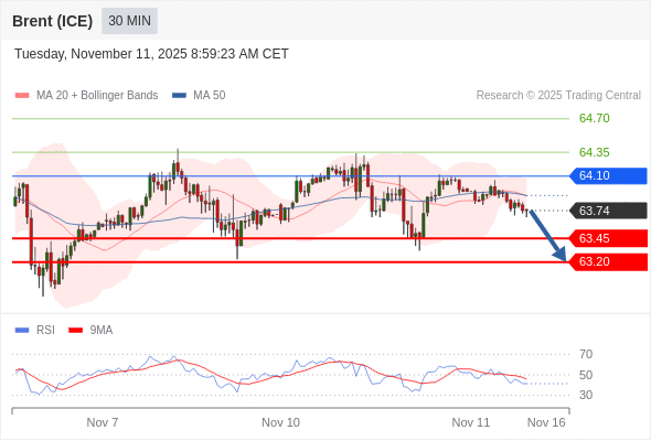 在 64.10 之下,看跌,目标价位为 63.45 ,然后为 63.20 。