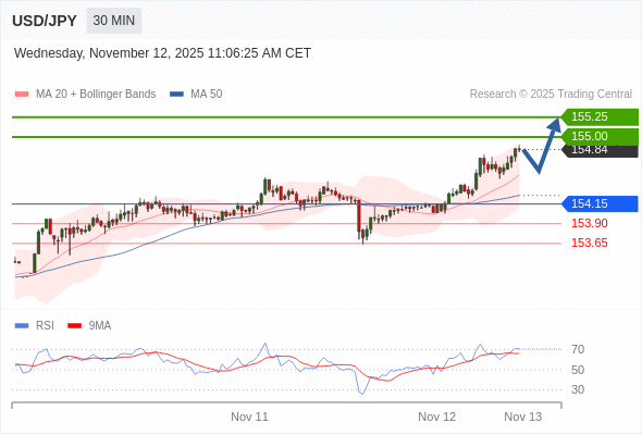 在 154.15 之上,看涨,目标价位为 155.00 ,然后为 155.25 。