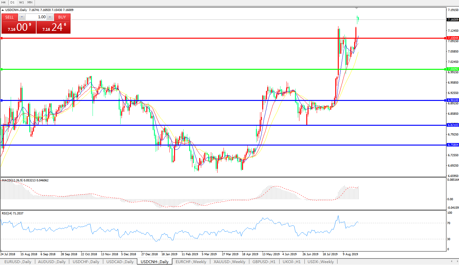 在岸周一收盘大跌逾700点,刷新11年半新低。交易员称,上周以来全球贸易前景消息面恶化,令原已紧张的经贸关系更加剑拔弩张,因此人民币走跌符合市场预期;短期汇价仍有一定跌幅,但随着市场对上述负面消息的敏感度降低,人民币继续大幅贬值的可能性不高,但需关注汇率超调风险。 分析人士称,人民币现在对消息面十分敏感,美元兑人民币升的有点快,有超调风险。从当前的情况看,进一步的贸易领域消息事件对人民币汇率影响程度呈边际效用递减态势,继续追高美元兑人民币的意义不大,风险比较高。瑞穗银行最新报告指出,贸易风险加剧将继续拖累人民币至少到年底。此外,中国央行公布的中间价在汇价走势方面仍有决定性作用。预计央行将在中间价中更多使用逆周期因子有序引导人民币走势。