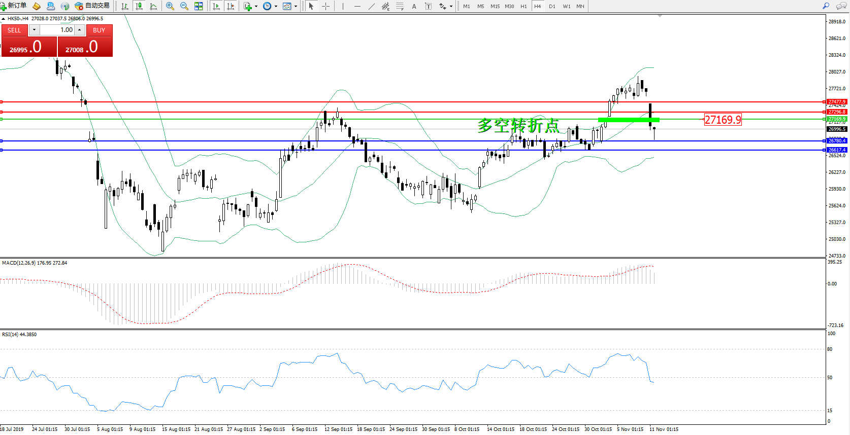 香港恒生指数1111日(周一)收盘下跌724.59点,跌幅2.62%,报26926.55点;港股大幅低开289点,随后再逐步扩大跌幅,恒指低见27002,似在退回27000关口。恒指的走势似乎确认了目前处于震荡的格局。或许经济周期的短暂恢复可能会让恒指有继续走强的理由,投资者正在谨慎评估贸易协议进展方面相互矛盾的消息与经济数据。但通胀、货币政策,以及各种各样不确定性带来的压力,也会限制恒指的走势。
