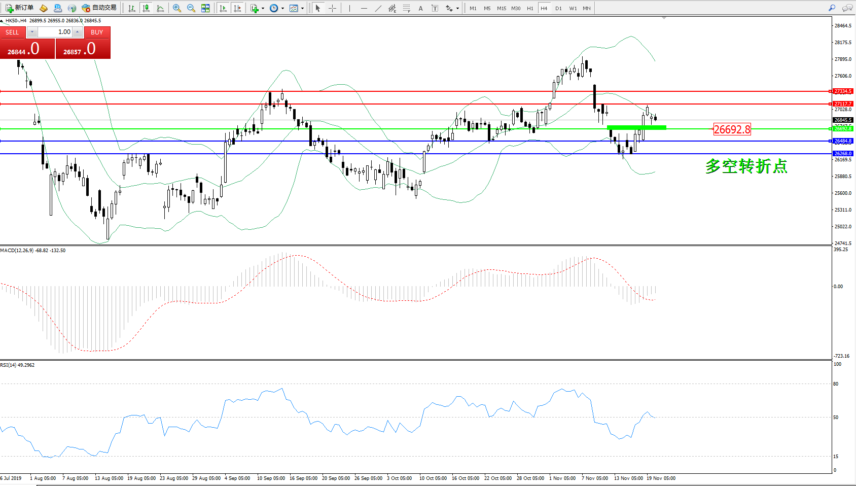 香港恒生指数1120日(周三)收盘下跌204.19点,跌幅0.75%,报26889.61点;恒生指数早间跌至26605.63点后止跌震荡,午后跟随内地A股升幅扩大,盘中稳步上升,蓝筹方面几乎全线收涨,手机零件股板块造好,瑞声、舜宇升幅位居蓝筹榜,医药、香港地产股升幅亦靠前。相反,石油、博彩板块表现不一,个别个股小幅走低。回顾恒指周二低开高走,重拾120日线,收市报27093.80点,上涨1.55%,成交额约799.06亿港元。港交所20日宣布,将于1126日阿里巴巴上市时,推出阿里巴巴期货、期权及相关的衍生权证。阿里巴巴也将于同日纳入可进行卖空的指定证券名单。