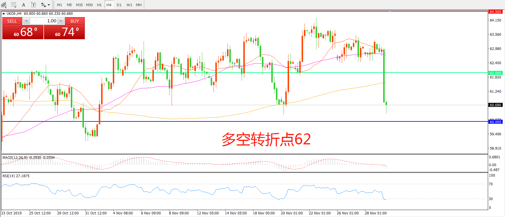 4小时图看,油价长阴下挫,上涨形态遭到破坏,200周期均线被跌穿,前期涨幅基本被吞没,60美元一线成为新的支撑,MACD红柱缩短,绿柱增加,RSI指标向下,日内下行概率较大。