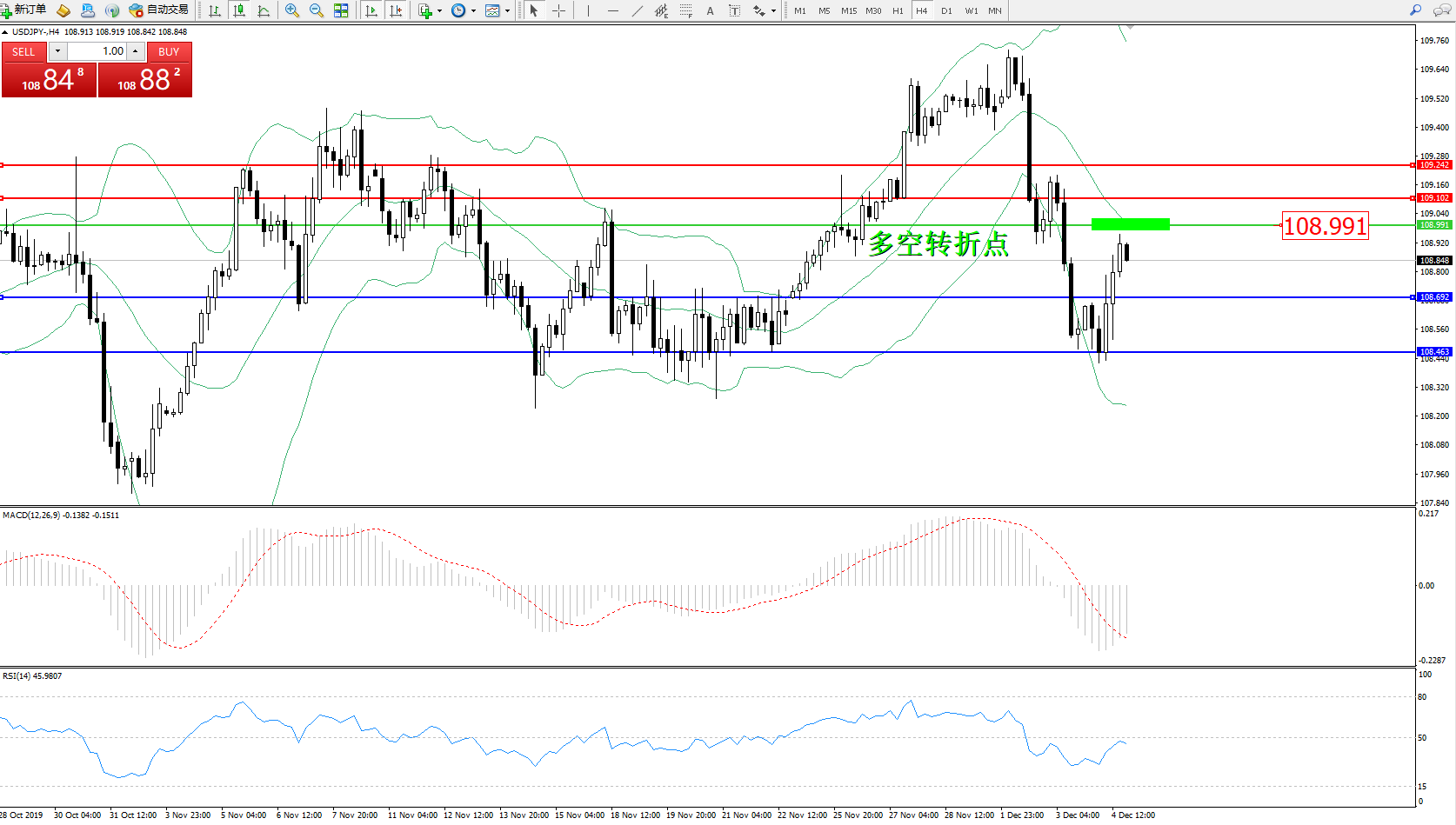 避险货币下跌,因风险意愿改善。美元兑日元上升0.21%至约108.86,盘中高点在108.96,受新一轮贸易相关市场乐观情绪推动,避险资产如日元黄金快速回落,美股三大指数股指期货在周三盘前止跌转涨。若此后美国经济数据表现继续低迷,恐重新激起市场对明年全球经济失速的担心,这会反过来推动各国央行进一步强化宽松。一旦如此,美元兑日元将打开更大下行空间。