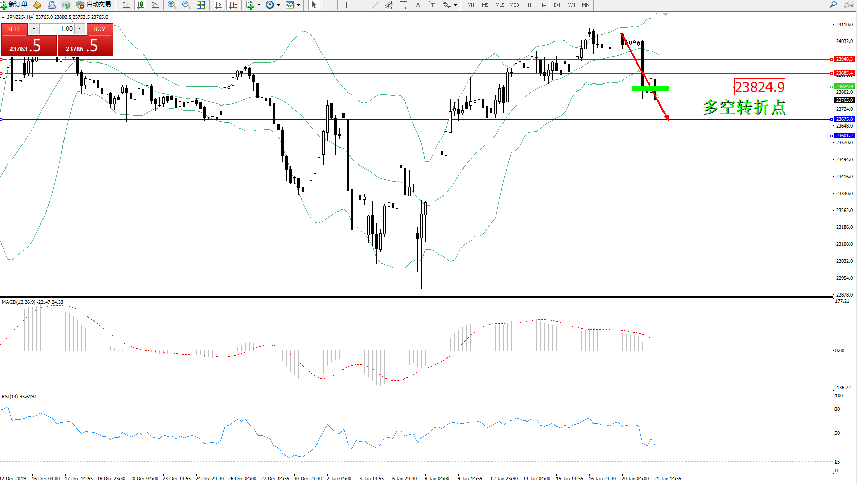 日经225指数1月21日(周二)收盘下跌234.01点,跌幅0.97%,报23849.50点。日本央行行长黑田东彦:日本经济正按照趋势温和扩张。至2021财年末,预计经济将保持扩张趋势。政府的经济刺激措施帮助提升日本GDP前景。下行风险主要来自海外因素。日本央行的通胀前景目标大体没有改变。物价保持上涨趋势,向2%的目标靠近。海外风险有所下降,但依旧高企。价格动能的风险值得关注。如果风险上升,将不会由于增加宽松措施。风险一旦实现将影响物价。中东地缘政治风险升高。来自于海外经济体的下行风险依旧较高。全球风险情绪的好转推动股市上涨。