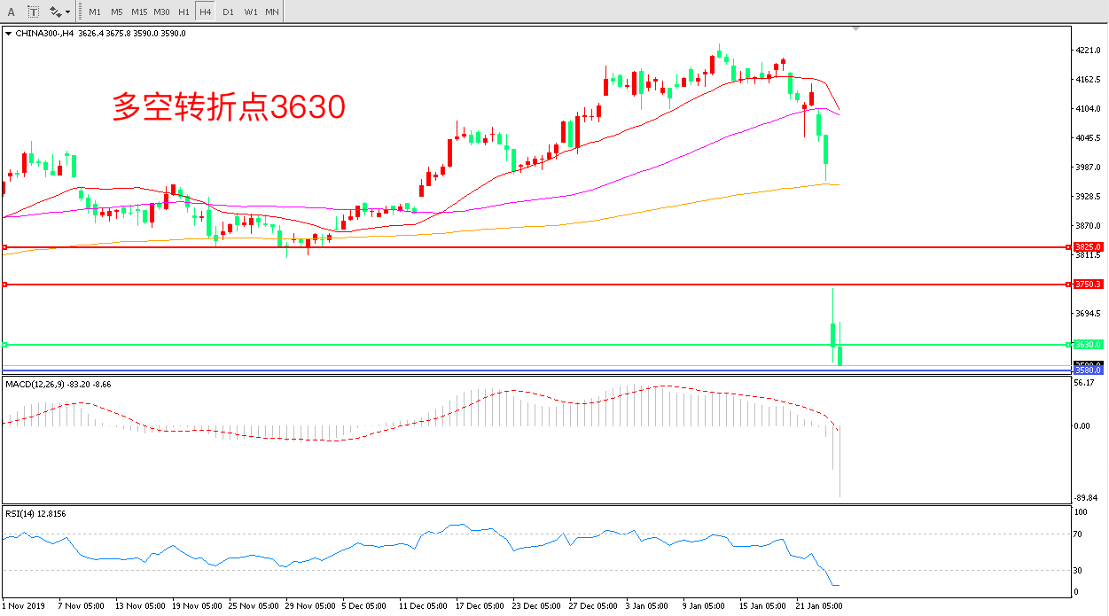 4小时图看, 沪深跳空低开震荡下行,整体走势低迷3580成为短期支撑,均线系统拐头向下,MACD红柱缩短,RSI指标向下,日内延续下行概率较大