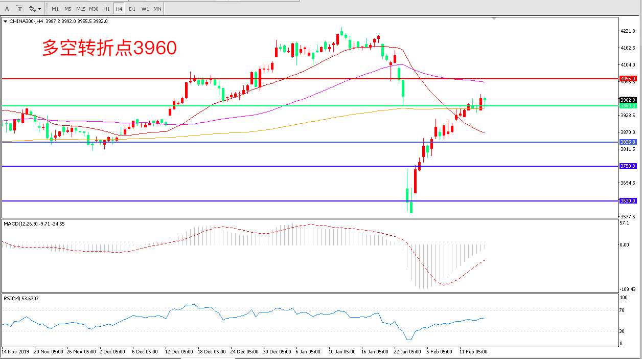 4小时图看,沪深300延续高位震荡,超跌反弹暂时告一段落,3960依然是短期多空分水岭,重点关注上方4055一线能否突破,均线系统走平,MACD绿柱缩短,RSI指标走平,近期延续上行概率较大。