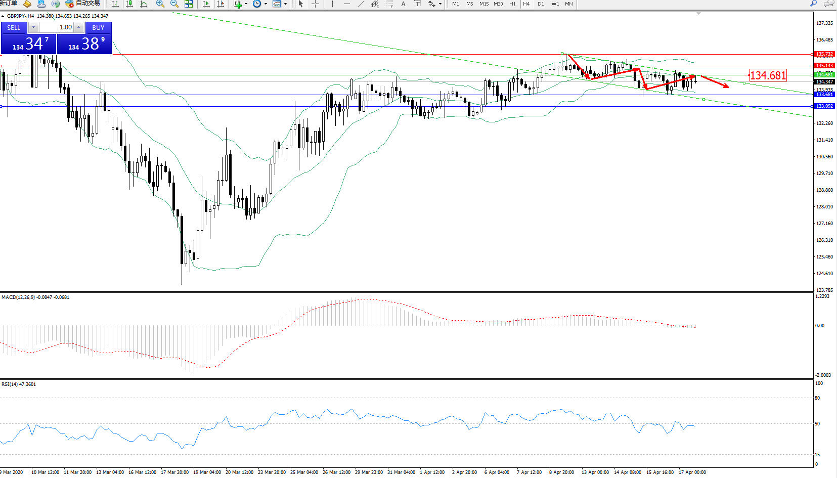 交易策略:134..681下方看跌,目标133.681、133.092