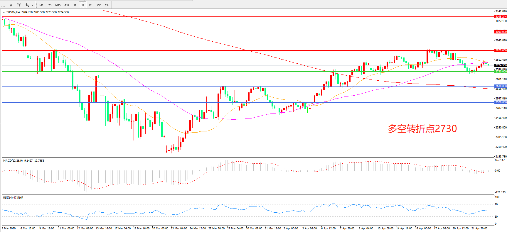 4小时图看,标普延续高位震荡, 2730成为短期多空分水岭,均线系统粘合成为短期阻力,MACD红柱增加,RSI指标走平,日内震荡上行概率较大。