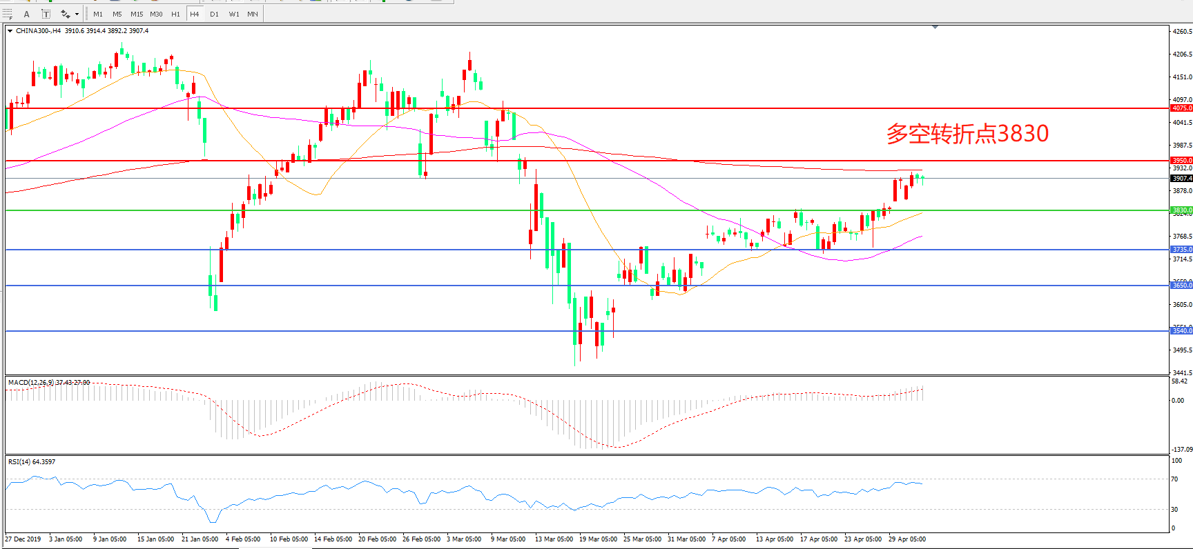 4小时图看,沪深300延续高位震荡,整体走势偏强,200周期均线成为短期阻力,均线系统拐头向上,MACD红柱增加,RSI指标走平,日内延续上行概率较大。