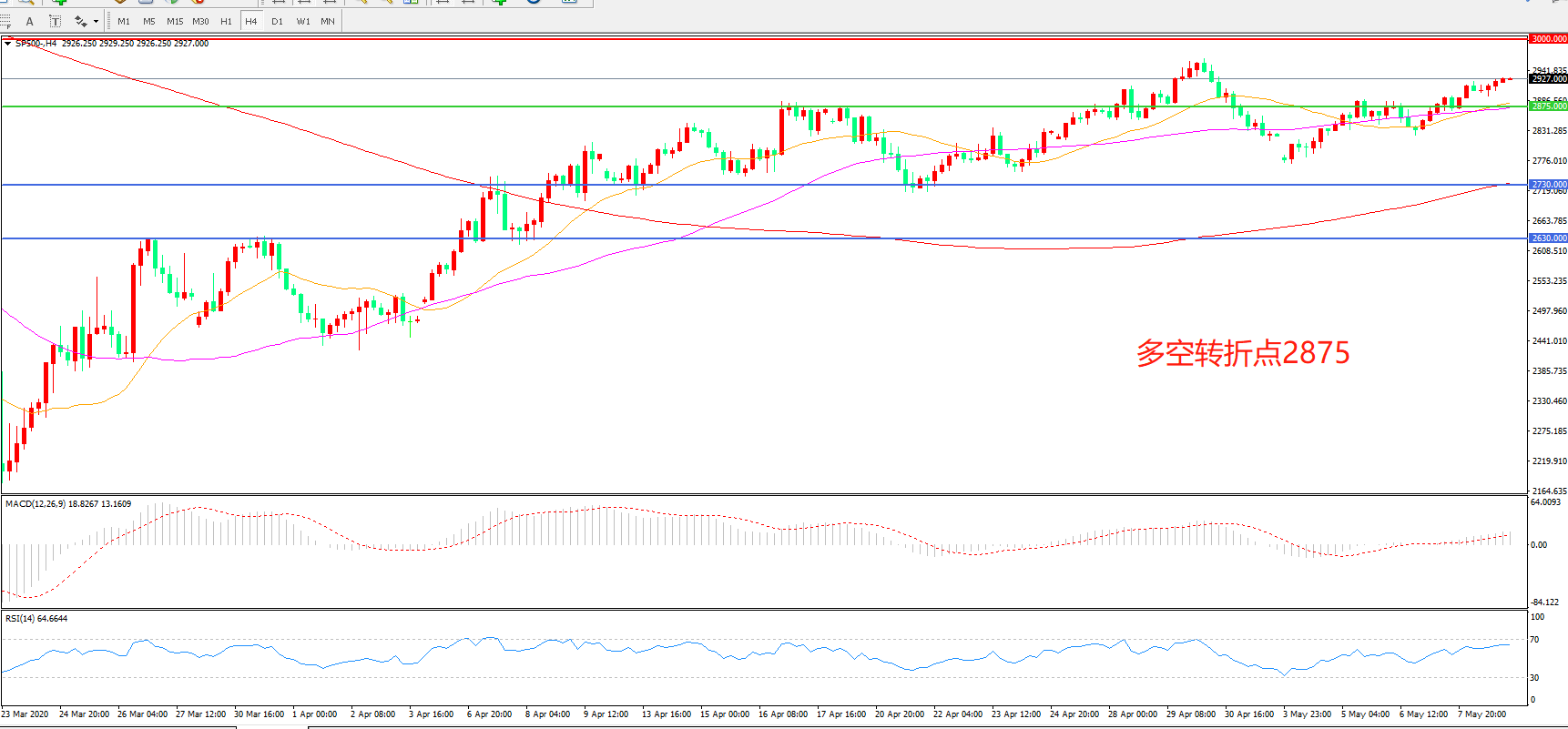 4小时图看,标普500震荡反弹,短期走势回暖,2875一线被突破,均线系统走平,成为下方支撑,MACD红柱加,RSI指标走平,日内延续震荡概率较大。