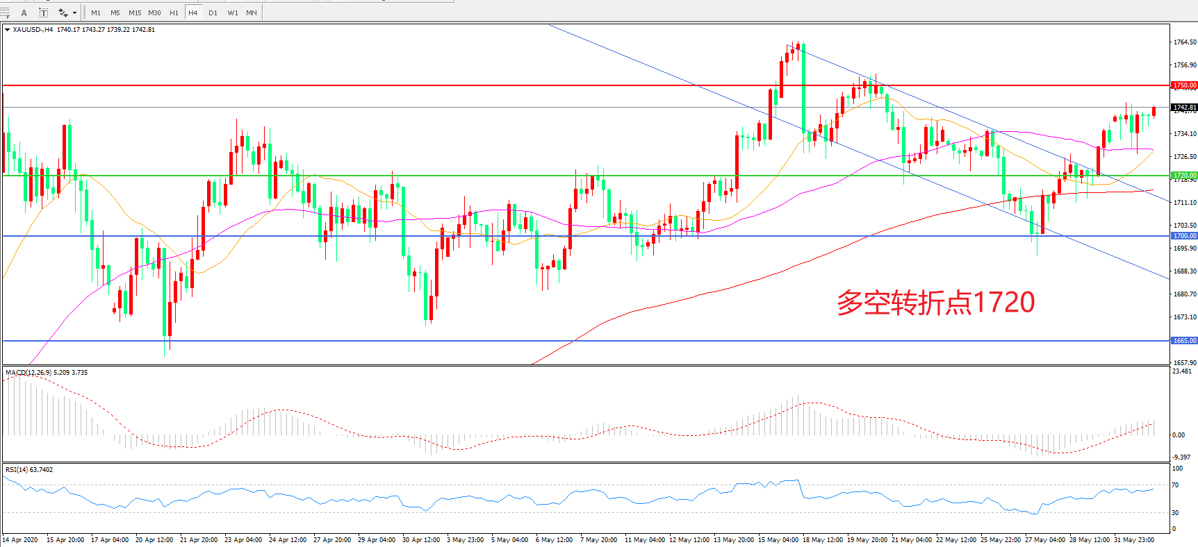 周一(6月1日)受美指连续下跌支撑,以及市场对地缘政治局势恶化和美国抗议影响的担忧,现货黄金小幅上涨,收报1742.38美元/盎司。不过,对潜在新冠肺炎疫苗问世的乐观情绪,以及各地解封,支撑全球股市升至接近三个月高位,这也让黄金能否突破前期高点打上了一个问号。