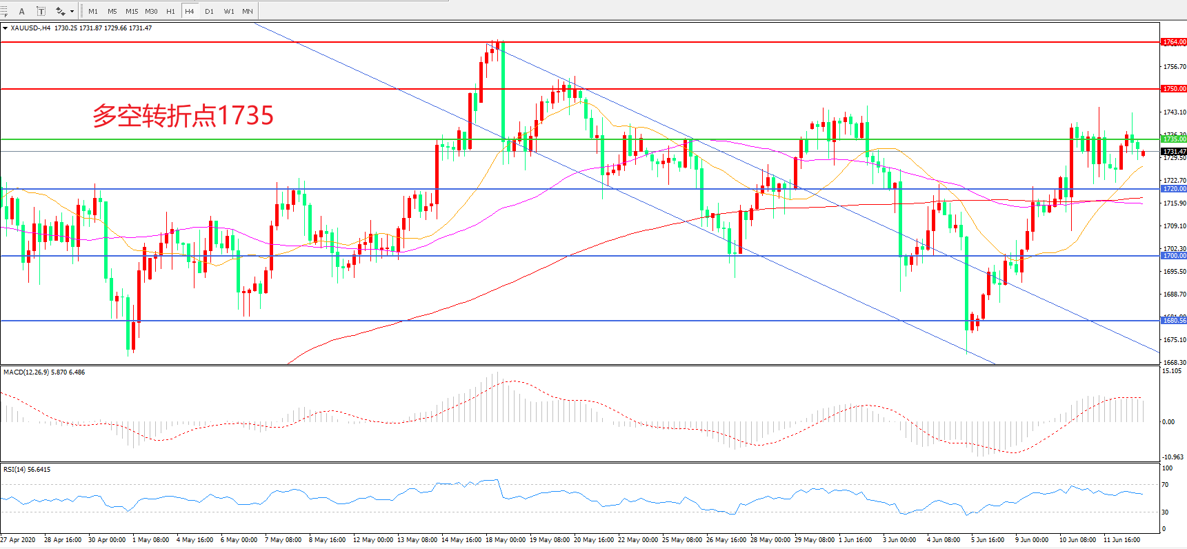 上周,全球金融市场呈现“冰火两重天”的态势,前半周,全球经济重启的乐观情绪持续高涨,美国数据惊艳市场,美元则遭遇持续抛售。到了周三美联储决议公布了经济前景的黯淡预期,再加上市场对于美国第二波疫情的担忧,市场走势风云突变,避险资金涌入美元与黄金,现货黄金大幅反弹,收报1732.16美元/盎司。