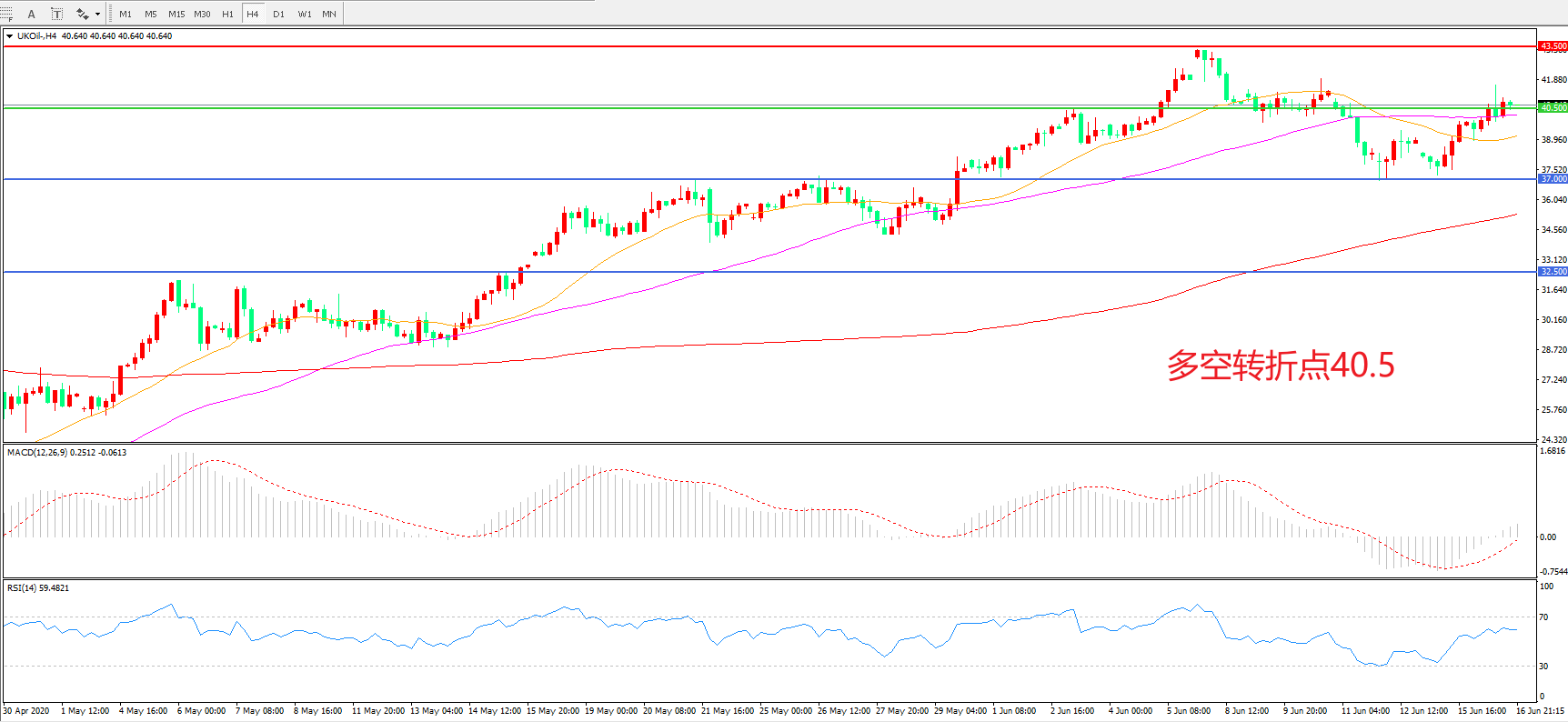 4小时图看,油价呈现区间震荡走势,37美元成为短期支撑,40.5美元成为短期阻力,均线系统逐渐粘合,MACD绿柱缩短,RSI指标走平,日内延续震荡概率较大。