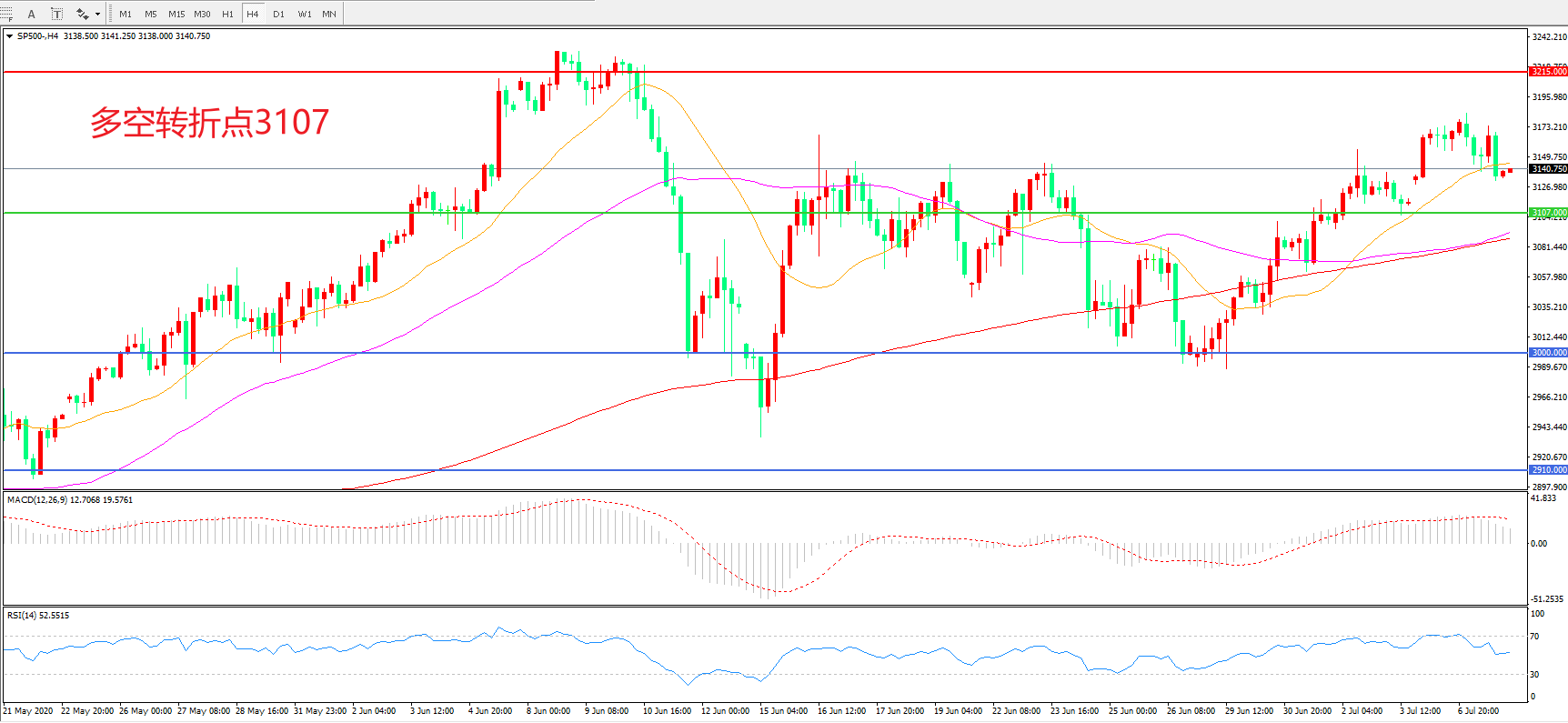 周二(7月7日),受美国退出世卫组织消息影响,市场风险情绪回落,标普500冲高回落,收报3139.25点。市场仍在关注美国冠状病毒疫情的反弹形势。在长周末和本周初,美国南部和西部各州的冠状病毒疫情继续爆发,使人担忧随后当局可能重新下令采取居家隔离与停工停业等措施、从而危及经济复苏步伐。