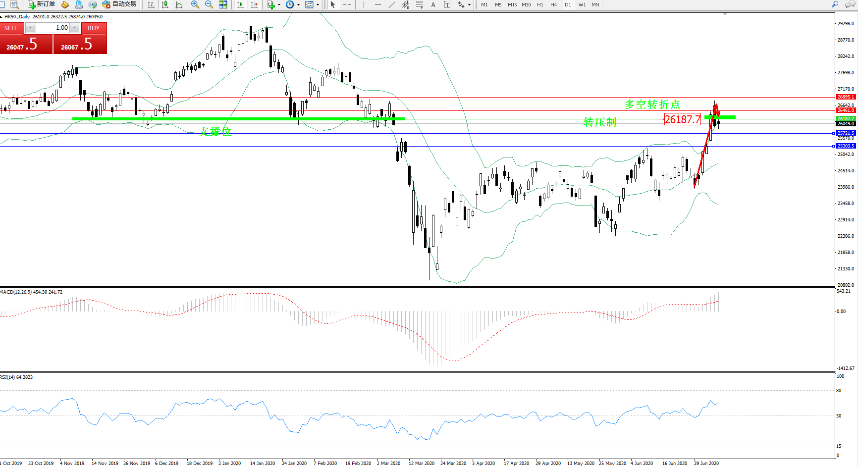 香港恒生指数78日(周三)收盘上涨153.52点,涨幅0.59%,报26129.18点;港股三大指数均收涨,恒指盘中震荡加剧,南下资金大幅流入103.25亿港元,大市成交额为1961亿港元。军工股崛起领涨,中船防务暴涨超55%;中资券商股、半导体再度强势,光大证券大涨近12%,在线教育股均走强;腾讯大涨5.23%,市值约5.19万亿超越阿里成为中国第一市值公司。美团点评(3690.HK)收于历史最高价,市值1.16万亿升至港股第7.A股的强势已经按耐不住,三大指数已经全面实现了反包,领头的创业板更是气势如虹。而港股的走势相对温和,因为外围的不利因素对港股构成制约,但在A股的强势带动之下,负面的影响力只会愈来愈小。目前指数已经不太重要,重要的是市场氛围,热点的全面活跃才是关键,核心资产继续受到踏空资金的青睐才是重点。