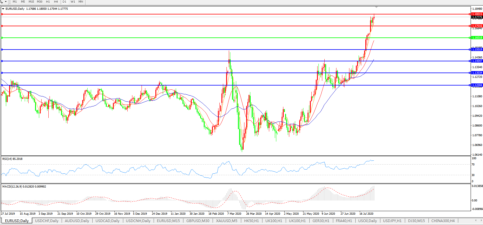 技术面简析:日图均线维持多头排列,汇价回落整理后借力上攻,MACD运行于0轴上方且量能再度回归 ,RSI开始走缓,预计短期汇价大概率将回落修正,关注1.18关口压制。