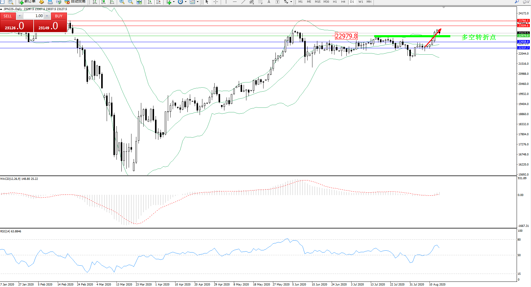 日经225指数8月14日(周五)收盘上涨25.89点,涨幅0.11%,报23275.50点。调查显示:日本2020财年GDP料下滑5.6%,2021财年料增长3.7%;日本2020财年核心CPI料下降0.3%,2021年料上升0.2%,全球地缘及贸易争端对日本经济有负面影响。日本第二季度季调后实际GDP年化季率将大幅萎缩27%,出现1955年以来最严重的萎缩;受累于美国国会旨在缓解疫情影响的新一轮救助计划磋商仍未打破僵局。大家正焦虑不安地等待在全球疫情和地缘与贸易局势等各方面出现的新消息,同时也仍对美国朝野的援助协议僵局感到担心。