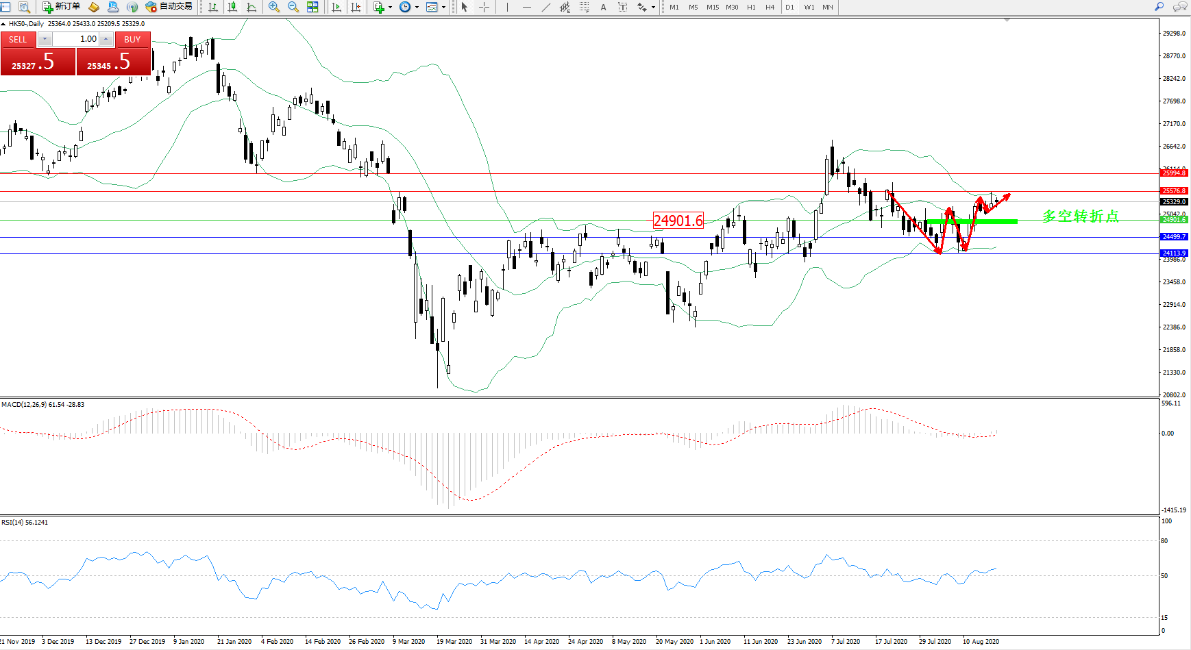 香港恒生指数8月18日(周二)收盘上涨20.04点,涨幅0.08%,报25367.38点;港股三大指数收涨,恒指全天窄幅震荡。黄金股强势,招金矿业大涨近7%;恒生科技成份股普遍造好,京东绩后大涨9.48%,美团点评涨7.7%,小米集团涨6.4%。今日南下资金净流入23.51亿港元,大市成交额为1268亿港元。港股大市仍处于调整期,但预期下跌空间不多,恒指可在24000点之上站稳。在8月业绩公布峰期临近,建议提前部署中期业绩有惊喜的股份。不改牛市基调。历史上牛市中的调整较为剧烈,多为布局机会。调整中重点关注低估值大金融板块阶段性补涨和成长科技行业长期产业趋势演进的配置机会。