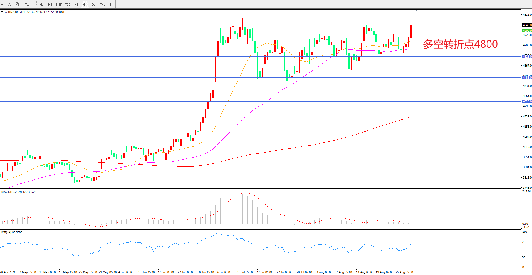 4小时图看,沪深300连续拉升,短期表现十分强势,4800阻力被顺势突破,均线系统拐头向上, MACD红柱增加,RSI指标向上,日内延续上行概率较大。
