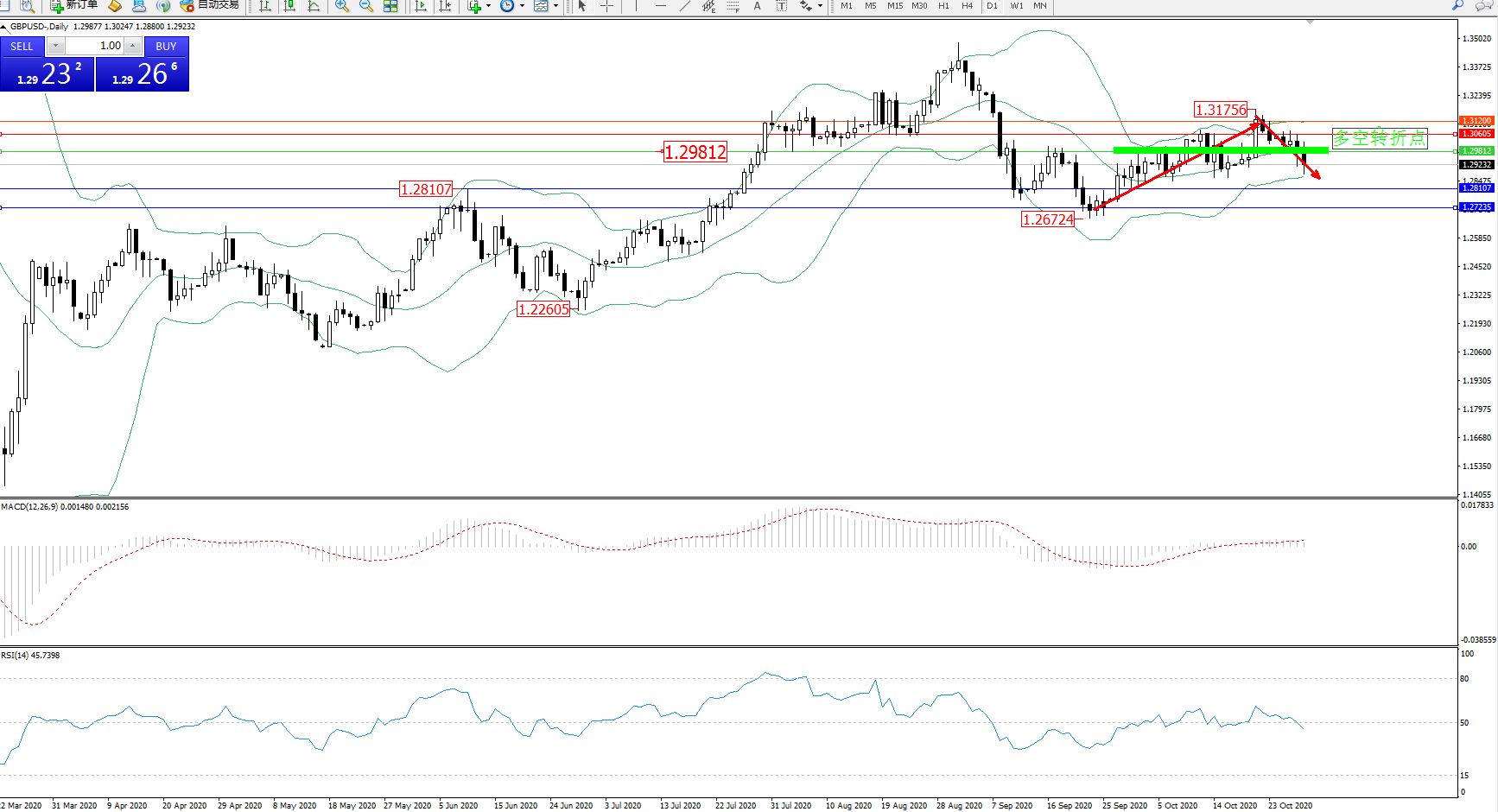 交易策略:1.29812下方看跌,目标1.28107、1.27235